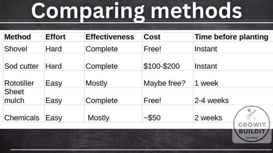 But for cost, the sod cutter and chemicals will not be free, but not overly expensive either. And rototillers can often be borrowed, and you will just have to pay for gas.