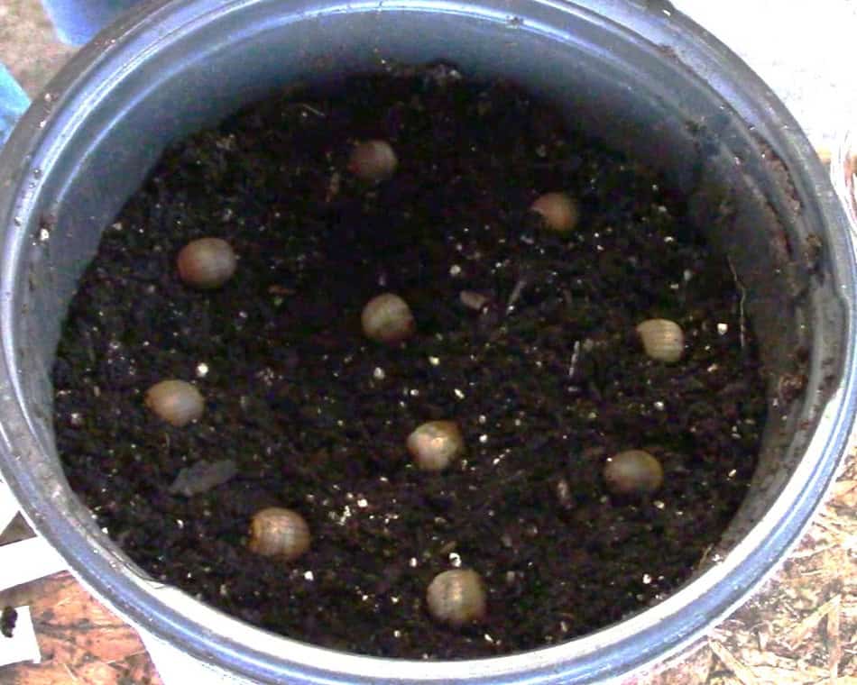 You can then either cold stratify in a moist potting mix or sand in the fridge for 2-4 months, or winter sow them. My personal preference is to winter sow the seed, and you can do this by filling a tall (9″) container with moist potting soil and planting the acorn 1-2″ deep, on it’s side. Keep the container in an unheated garage or shed, and add a small amount of water each week to make sure it doesn’t dry out.