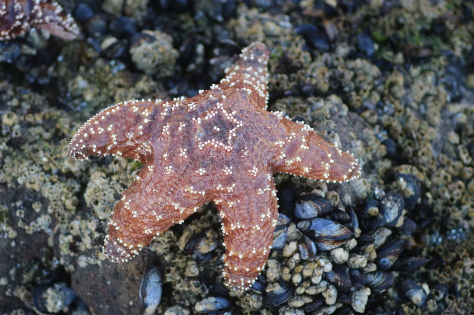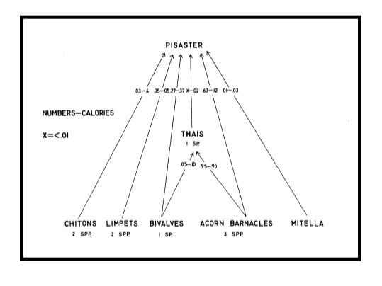 Paine found that there were two main predators in Mukkaw Bay – the Ochre Sea Star (Pisaster ochraceus) and a snail, Nucella emarginata. And both would consume the various mollusks, however, when the starfish was removed, the biodiversity plummeted. Essentially N. emarginata (alone) could not eat barnacles fast enough, and these barnacles would reproduce quickly and take up all the available space. Thus, the number of chitons, limpets, bivalves, and other organisms dropped to almost nothing. The starfish can normally consume 40-60 barnacles at a time. When the snail consumed barnacles, it left the shell. And this rendered the space unusable for other mollusks.