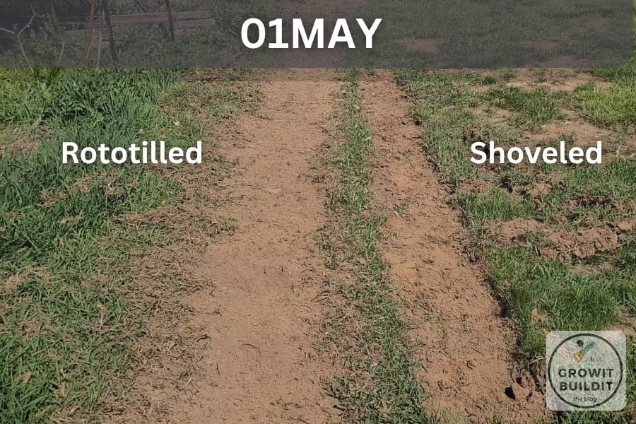 The main thing to note in my results though – is that while I did not see any explosion of weed seeds, the main thing that happened was the grass continued to grow and creep back into the open ground. This was due to two reasons, first, my tilling was not perfect (as the results show). So there were isolated grass plants that stayed behind that I missed. And these plants did what plants do in the spring – they grew.