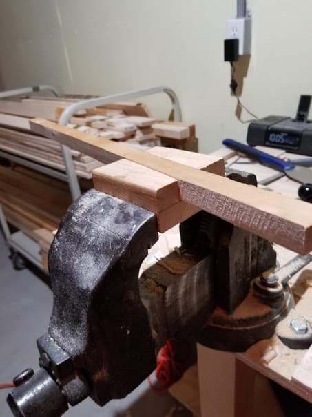 The first step is to cut all boards to length, and rip the clamp rods. I don’t have a table saw, but doing so by hand only takes a few minutes. I quickly cut some scrap 2×4 to length as well, at a rough distance without measuring. This is a scrap project so my risk is low!