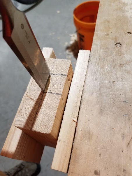 After a couple of good chops, flip the piece over and repeat these steps from the other side. Now you should roughly have the slot cut. Give it a test fit, and clean up the insides with a chisel.