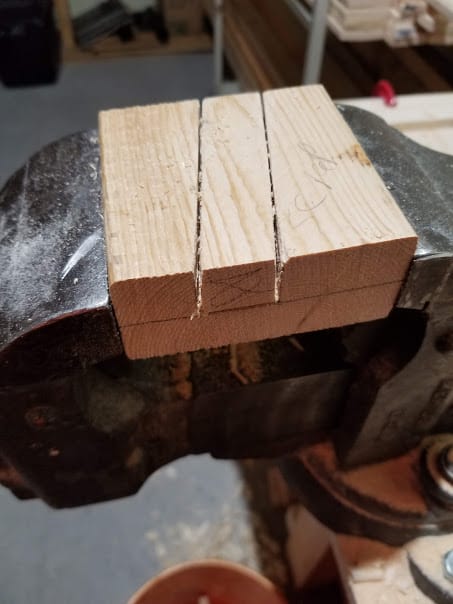 Next, clamp it in the vice and cut along the lines. One tip I will give you is to give a light tap with a chisel along the lines. This will help you get your cut started with the saw, and will kind of serve as a stop line. Cut down until you think you are at the correct depth.